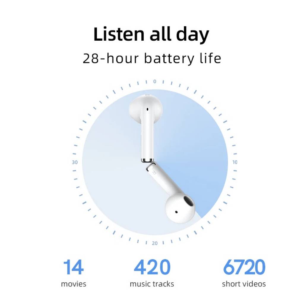 - Duración de la Batería: Cada auricular ofrece hasta 7 horas de reproducción continua con una sola carga, y el estuche de carga proporciona hasta 21 horas adicionales, sumando un total de 28 horas de reproducción.