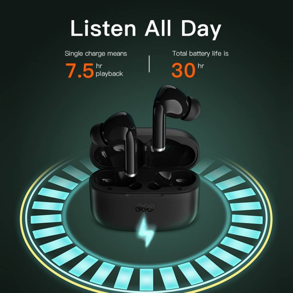 - Duración de la Batería: Cada auricular ofrece hasta 5 horas de reproducción continua con una sola carga, y el estuche de carga proporciona hasta 20 horas adicionales.