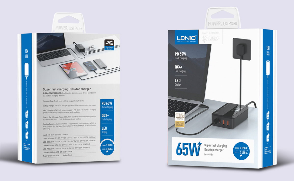 Optimiza y organiza tu espacio de carga con el Cargador de Escritorio LDNIO A4808Q Negro. Con una potencia total de 65W, este cargador de alta velocidad te permite cargar hasta cuatro dispositivos simultáneamente a través de sus 2 puertos USB-C (PD3.0) y 2 puertos USB-A (QC4.0/QC3.0). Es compatible con los principales protocolos de carga rápida del mercado, ideal para iPhone, Samsung, Huawei, Xiaomi y más. Además, cuenta con una práctica pantalla LED que muestra el estado de carga y está fabricado con material ignífugo para tu seguridad. Su diseño compacto y elegante en color negro texturizado, junto con el cable de alimentación de 1.5m incluido, lo convierten en la solución perfecta para tu escritorio.