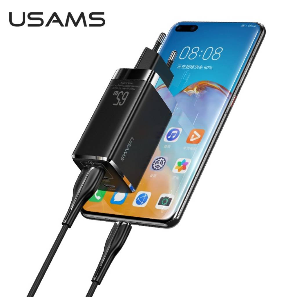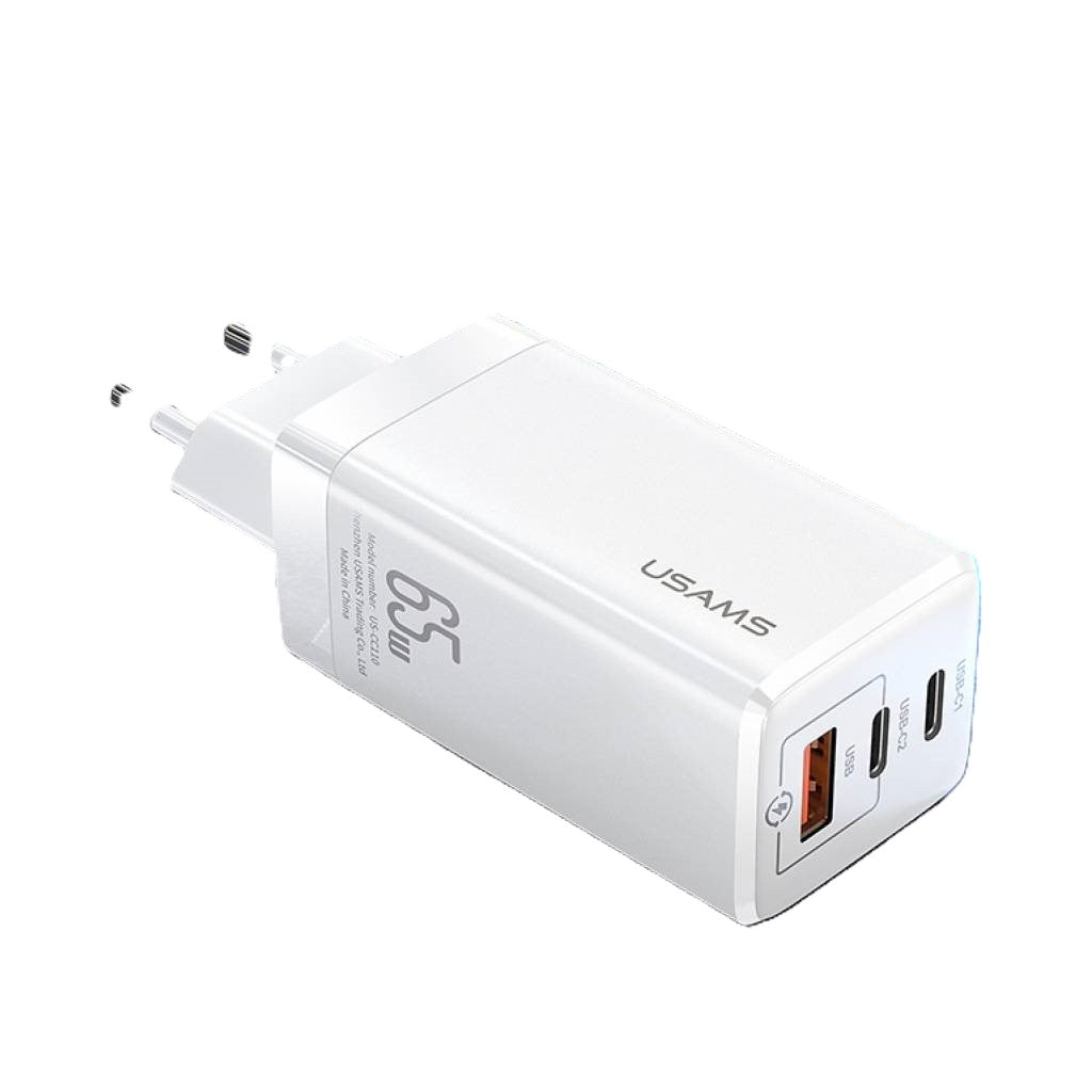 El cargador de pared CC110 T33 de USAMS ofrece 65W de potencia con tecnología GaN, brindando carga rápida en un diseño compacto y eficiente.